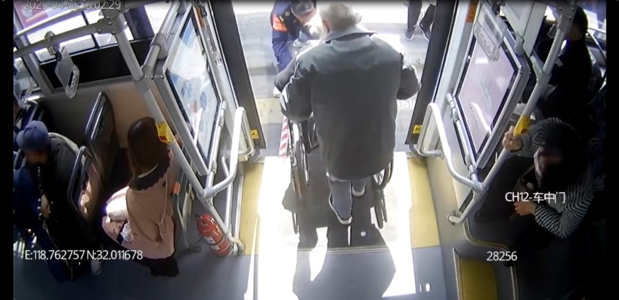 车辆到达了中华门城堡站点,池海龙将车停稳,配合王大爷地将王奶奶和轮椅送下公交车。虽然没有过多的语音交流,却配合的相当默契,车上的乘客们目睹了这一幕,纷纷对16路驾驶员投来赞许的目光。