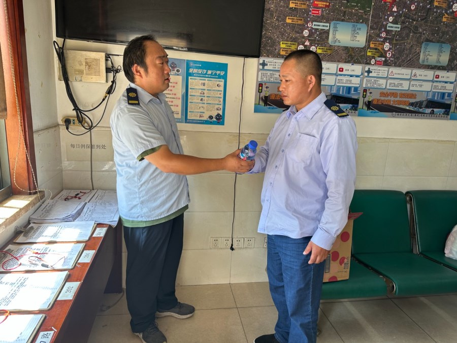 在繁忙的公交站头,公司领导班子成员与等待发车的驾驶员们亲切交谈,详细询问他们的工作状态和身体情况。“天气热,大家一定要注意防暑,多补充水分,调整好精神状态,确保行车安全。”领导们反复叮嘱驾驶员,既要优质服务乘客,也要时刻关注自身健康,合理利用休息时间调整状态,避免高温疲劳作业。一句句贴心的提醒,让顶着烈日作业的驾驶员们倍感温馨。