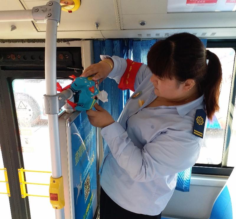 扬子公交大厂公司汽车四队650路驾驶员倪凯是车队的微笑服务明星,8月2日中午,她利用休息时间,在闷热的车厢里开始忙活起来。她要在车厢的宣传栏和驾驶室旁装纸巾盒,这是为什么呢?