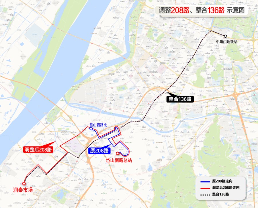 整合后线路北段由62路、96路、153路替代;南段由调整后的208路覆盖。