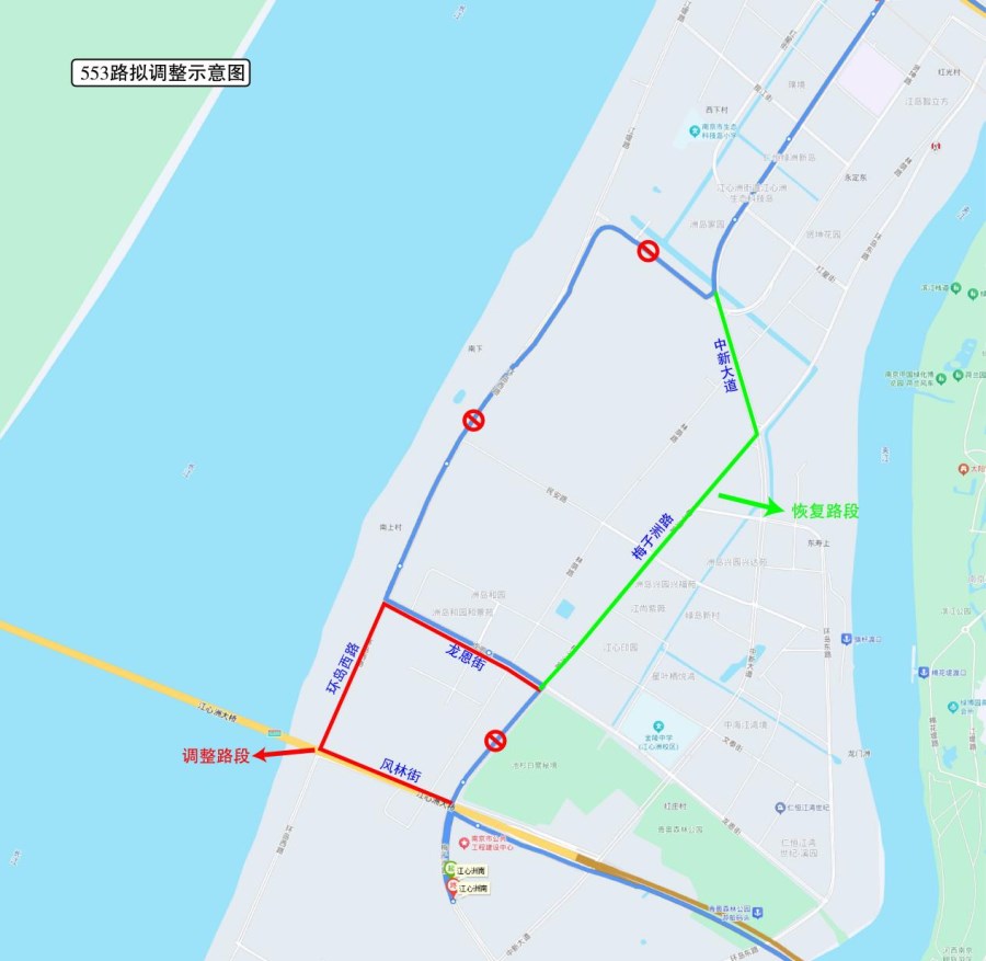 * 走向变化:首末站不变,线路南段自“康安路浦滨路”路口起,拟沿康安路、研学路、康华路、横江大道、天浦路隧道、天浦路、火药洲路、镇南河路回正线运行。线路北段自“横江大道定山大街”路口起,拟沿扬子江生态公园1号岗进入公园内部道路运行。(返程路段相同)。