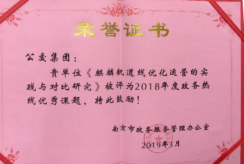 2019年6月28日,南京公交集团捧回2018年度市12345政务热线工作先进单位奖牌,《麒麟轨道线优化运营的实践与对比研究》荣获了南京市政务办唯一一个优秀课题奖。