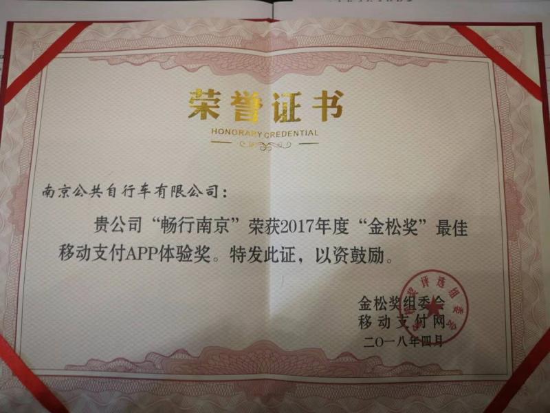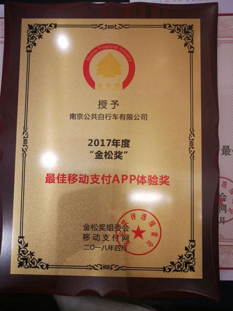 南京公共自行车荣获2017年度金松奖“最佳移动支付APP体验奖”