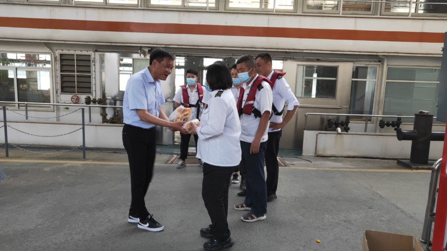 6月14日上午,轮渡公司党委书记、总经理张勇和纪委书记、工会主席陈宝云来到宁浦航线为在岗职工发放提前购置的粽子、鸭蛋等端午节传统食品。