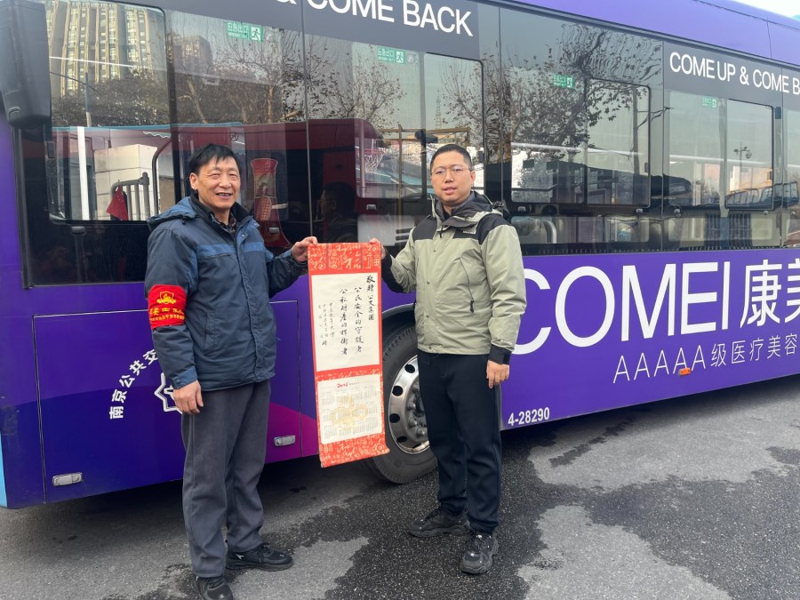 2024年12月26日上午,南京公交31路车队场站迎来了一位特殊的市民乘客。她手持写有“敬赠公交集团:光明安全的守护者,公司财产的捍卫者”字样的日历卷轴,专程前来对31路驾驶员拾金不昧的高尚品德以及车队管理人员的热情服务表达深深的赞许与感激。