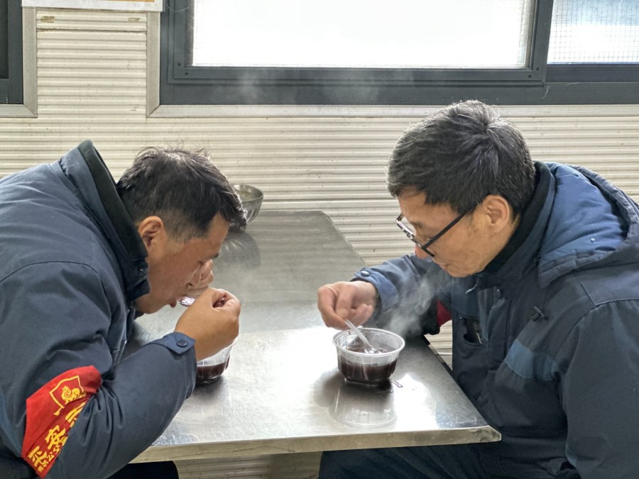 清早车队工作人员便已在食堂忙碌开来。泡好的糯米、红豆、红枣、薏米等食材在大锅里翻滚,经过2小时慢熬,香甜软糯的腊八粥新鲜出锅,色泽鲜艳,口感丰富,既有糯米的软糯,又有豆类的香甜,还有莲子的清新和桂圆的甜蜜,待装碗后一一递到职工手里。