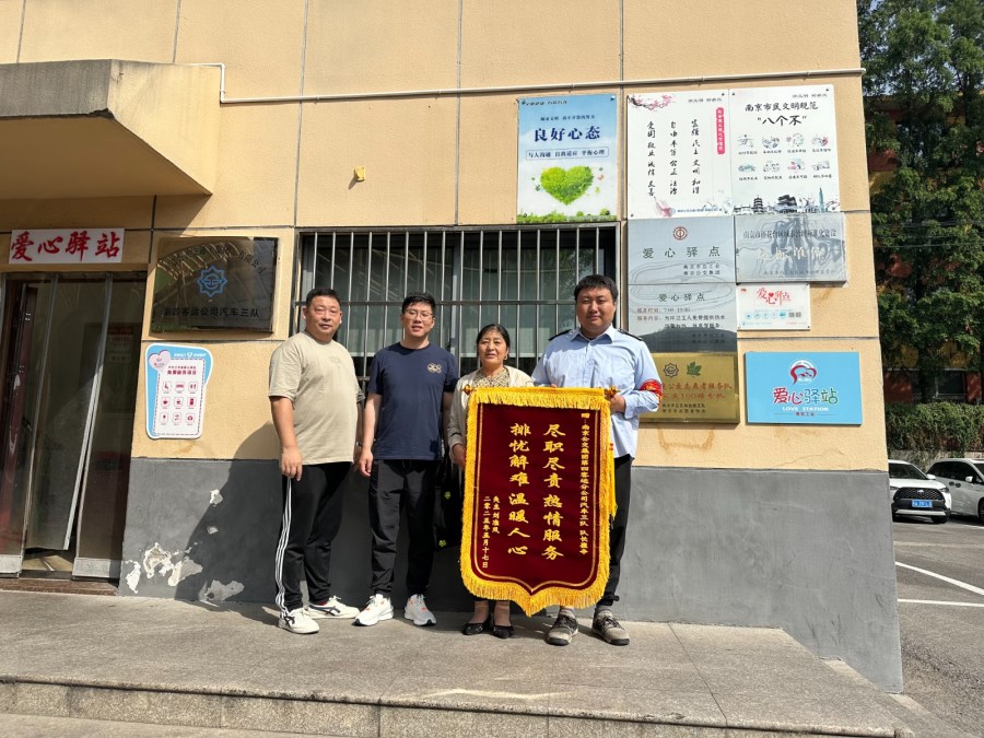 5月19日清晨,外地乘客刘女士来到南京公交第四客运公司汽车三队送来一面写有“暖心相助显真情公交服务暖人心”的锦旗,向公交车队管理人员崔幸和车队长朱志华表达谢意。