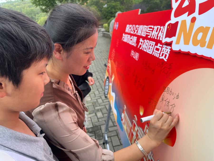 国庆长假期间,34路中山陵停车场站点成为四公司志愿服务活动的核心“阵地”。每日清晨,四公司工作人员便提前到位,精心布置好印有“南京公交邀您写祝福”的签名板,热情邀请过往市民参与互动。市民们纷纷驻足,或在签名板上写下对祖国的美好祝愿、对公交服务的改进建议,以及表达对绿色出行的支持,字里行间满是节日的喜悦与对城市的热爱。