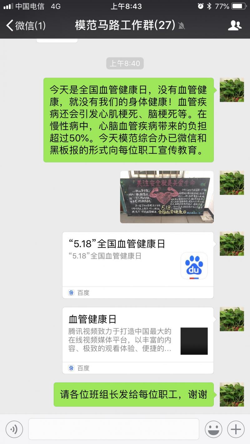 5月18日是"血管健康日",物业公司各综合办开展了形式多样的关爱教育活动,唤起职工主动管理血管健康,降低中风、心梗等突发心血管事件的发生。